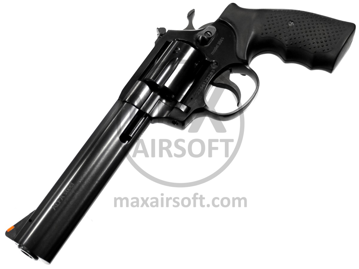 Revolver M3561 6" made by Alfa Proj chambered for the powerful .357 Magnum cartridge. It is made out of stainless steel with a double trigger mechanism and rubber grips. Drum holds 6 .357 Magnum rounds. Revolver comes with the box and two brushes.