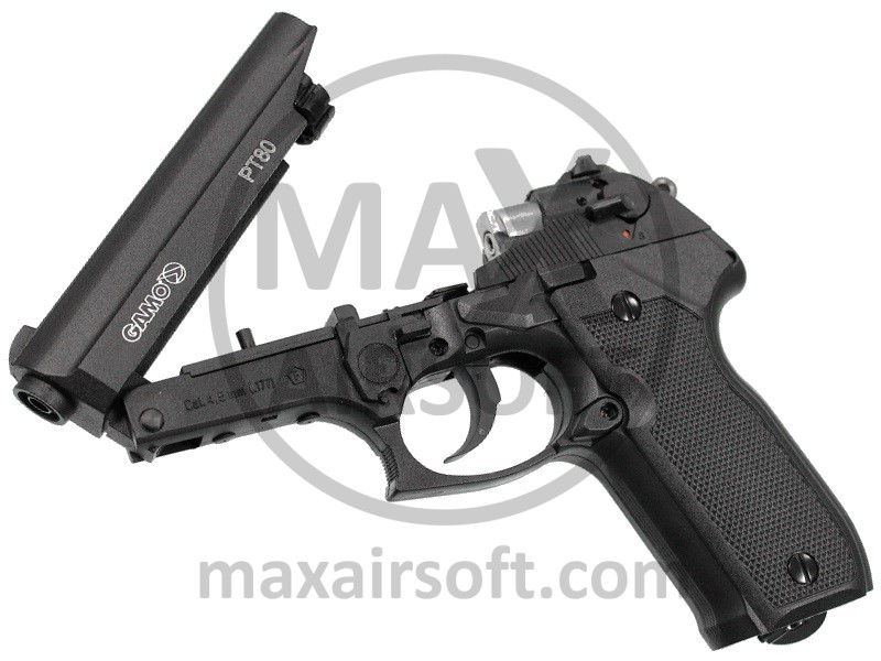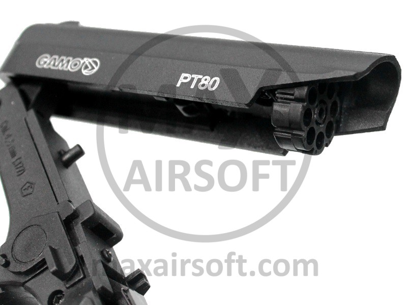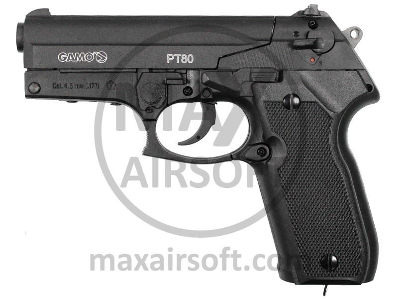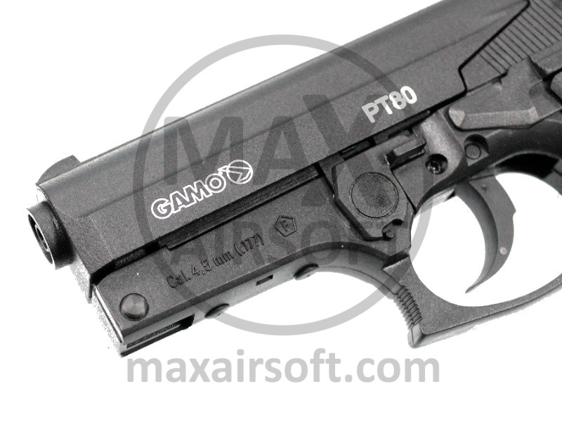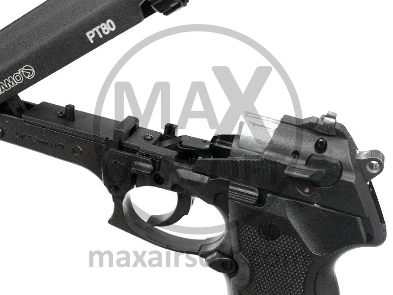 PT-80 CO2 Air Pistol by Gamo made out of metal and plastic. Pistol shoots semi-auto, is very reliable and easy to use. It uses standard 12g CO2 cartridge that is inserted from bellow and has 3 magazine with 8 metal 4,5mm (.177) Pellets capacity.