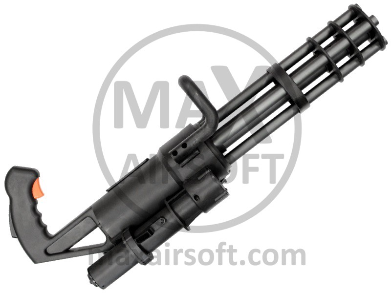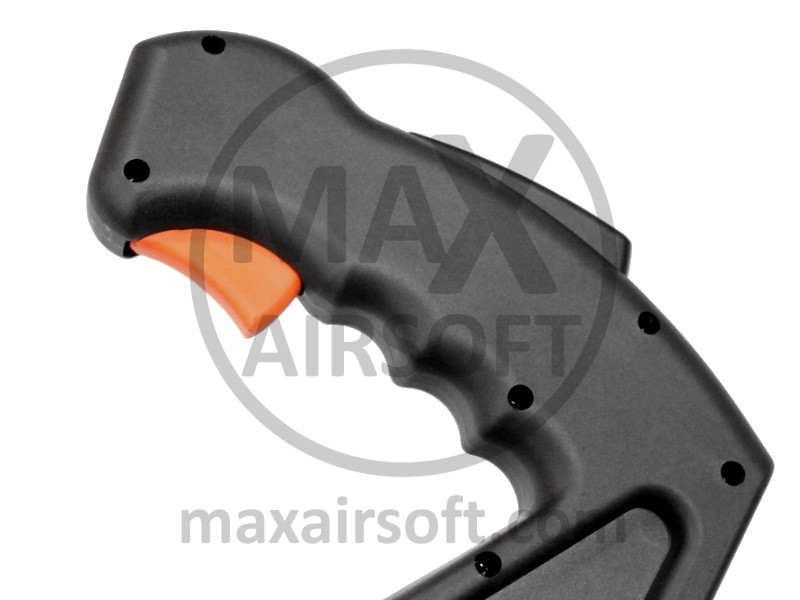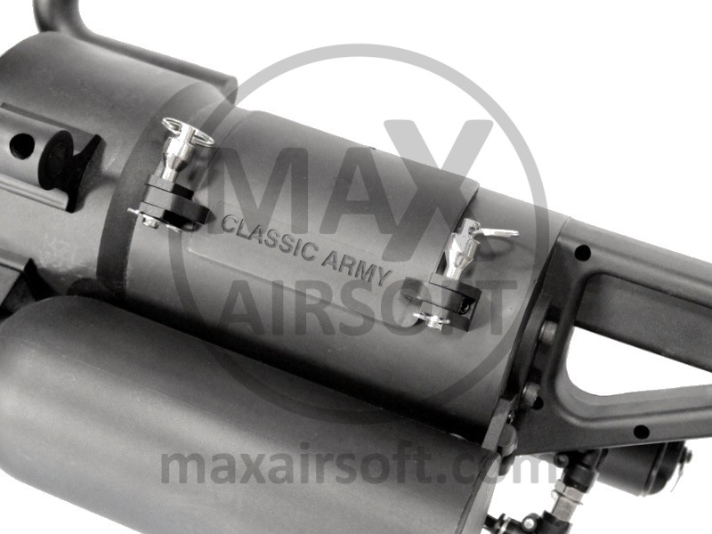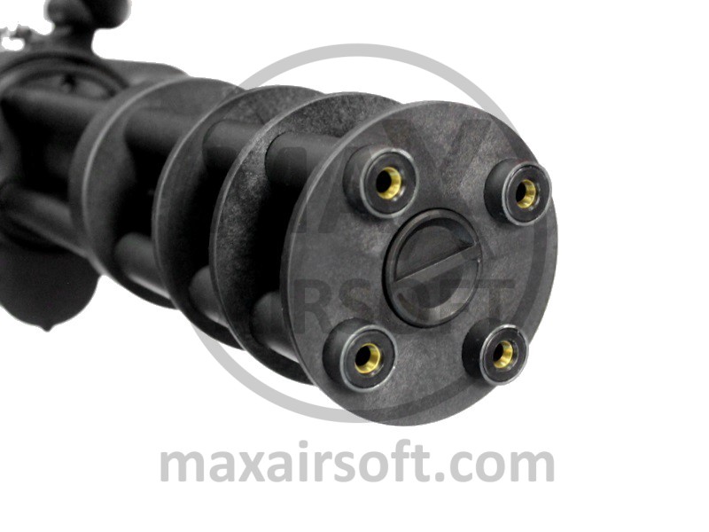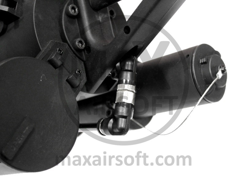 It works on a combined Electro AEG and Gas/Air(HPA) drive - an electric motor with NiMh or Lipo battery drives a rotary barrel system, and the gas or air HPA system fires BB's. In each barrel there is 350 mm AEG inner barrel with its own Hop-Up system and in the cylindrical body of the electric drive system there is a space for a gas can of the appropriate size with thread on the valve (other cans need a rubber hose with a suitable adapter for the external connection).