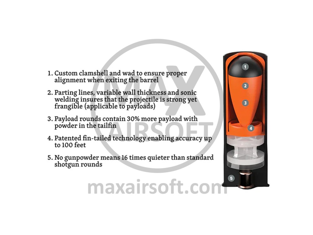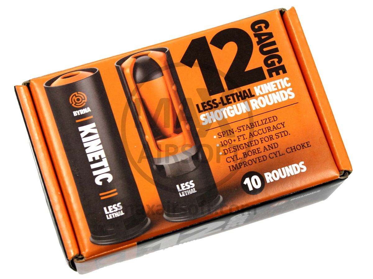 Byrna Kinetic Slug 12GA Less-Lethal naboj ne vsebuje smodnika in se napaja le s netilko. Kinetic Slug Naboji so bili zasnovani za delovanje v repetirnih šibrovkah ali enostrelnih puškah in ne bodo delovali v polavtomatskih puškah, ker ne vsebujejo smodnika, lahko pa jih ročno repetirate in streljate skozi večino polavtomatskih šibrenic. Byrna Less-Lethal Naboj je natančen do 30 metrov in ne vsebuje kemičnih sestavin.